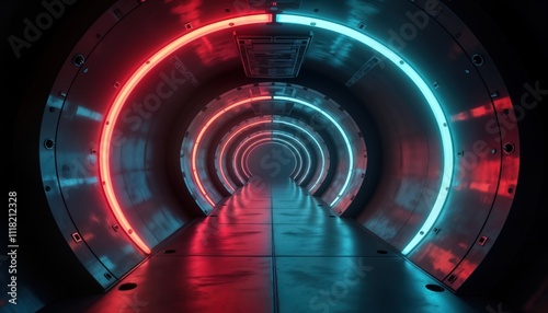 Futuristic tunnel passageway with neon lights. Dark interior design. Metal walls. Glowing red, teal neon light creates abstract futuristic scene. Modern industrial style. Underground futuristic