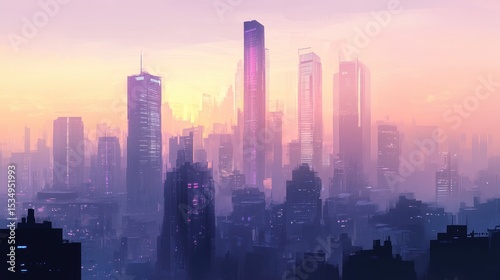 Futuristic Urban Landscape at Dusk with Skyscrapers Shrouded in Mist and Soft Neon Glow Under a Purple Sky