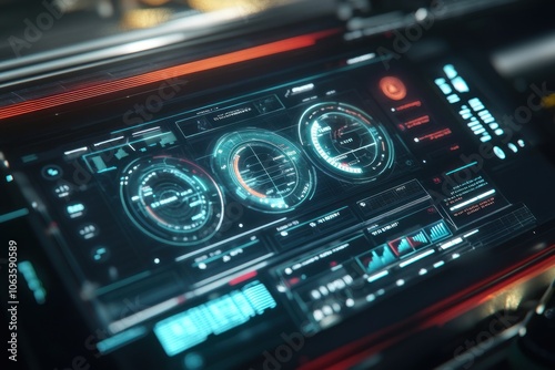 Futuristic Vehicle Dashboard with Illuminated Gauges and Digital Display