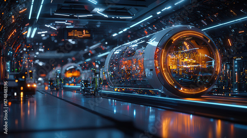 futuristic, warehouse, technology, conveyer, belt, robotic, system, glowing, industrial, science fiction, automation, machinery, neon, light, design, innovation, transport, storage, environment, advanced, digital, architecture, interior, space, modern