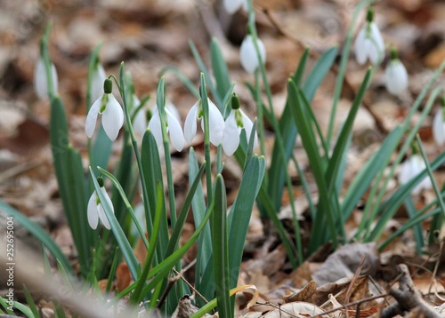 Galanthus elwesii blooming in the spring forest