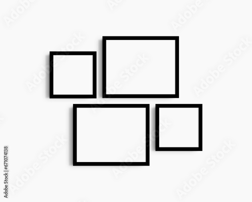 Gallery wall mockup set, 4 black frames. Clean, modern, and minimalist frame mockup. Two horizontal frames and two square frames, 14x11 (14:11), 8x8 (1:1) inches. White wall.