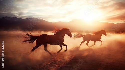 galloping. Galloping horses create a dust cloud in the desert, capturing dynamic movement and energy. event key visuals, club posters, designed for sports event promotions and stadium branding.