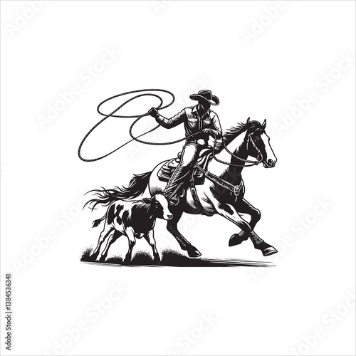 cowboy, horse, rodeo, steer, lasso, rope, cattle, ranch, galloping, chasing, wrangler, western, wild west, equestrian, farm animal, ranching, cowboy hat, saddle, boot, action, speed, strength, agility, determination, classic, competition, frontier, tradition, dust, motion, rustic, barn, skill, discipline, outdoors, sport, adventure, american west, legend, fast, dynamic, countryside, heritage