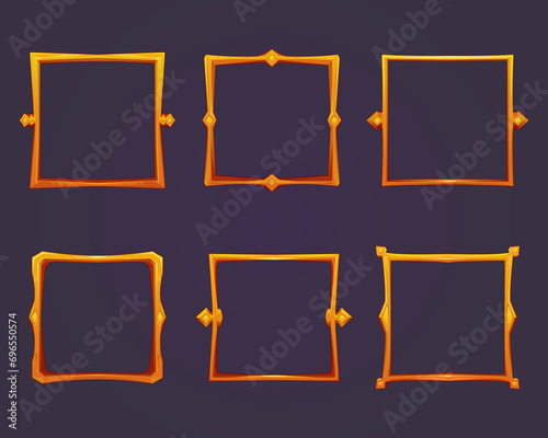 Game UI design with gold frame. Frame template in cartoon style. Isolated set of vector frames. Decorative frames for avatar, place text, social media, banner, web and mobile design, cover book.
