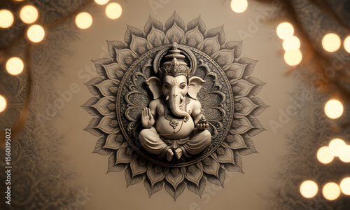 ganesh, hindu, deity, mandala, figure, carved, ornament, art, religion, spiritual, decorative, beige, light, design, symbol, indian, culture, religious, bokeh, lighting, image, background, god, sculpture, pattern, floral, isolated, copy, space, india, tradition, ancient