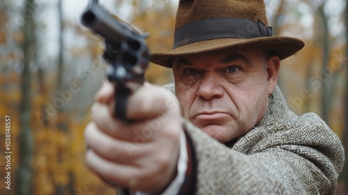 Gangster, stern-looking man wearing fedora hat and tweed coat aims revolver directly at viewer. autumn forest in background creates tense, cinematic atmosphere, evoking noir or gangster film