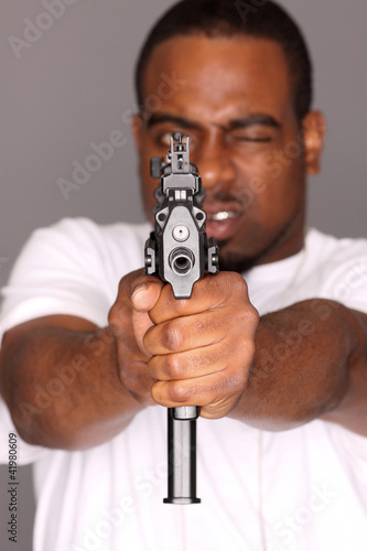 male, man, adult, gang, gangster, criminal, crime, african american, black, gun, weapon, automatic, aim, point, firearm, indoor, inside, studio