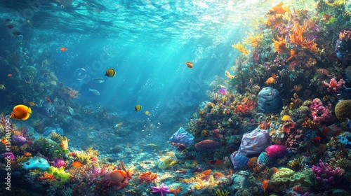 Garbage in deep sea with sea life. Human activities impact and threaten animal’s natural habitat.