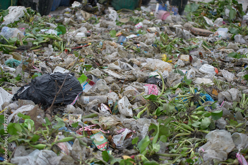 garbage waste landscape, many of waste garbage plastic, bottle, paper for background, pollution from garbage dump many, yard of plastic waste trash dirty rubbish