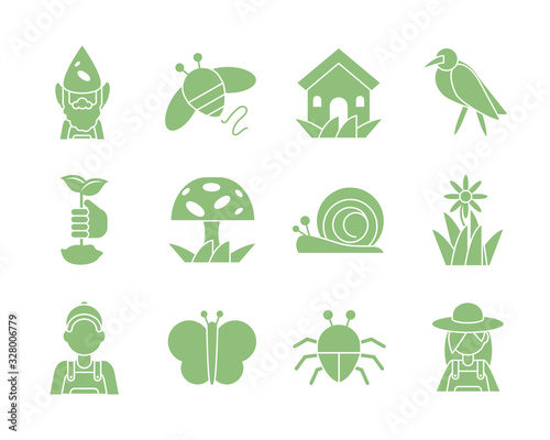 gnome, bee, house, bird, plant, mushroom, snail, flower, man, butterfly, bug, woman, garden, gardening, nature, icon, silhouette, set, style, summer, vector, outdoors, spring, floral, botany, horticulture, botanical, work, flowerbed, grow, blooming, design, gardener, landscape, environment, season, tool, landscaping, hobby, agriculture, natural, growth, park, outside, tool, farm, activity, leisure, cultivating, fresh