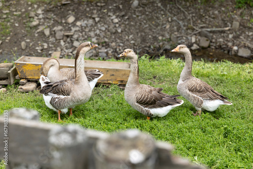 Geese standing in green grass in Osturna, Slovakia