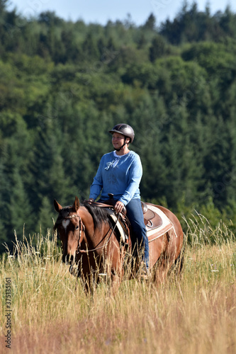horse, equitation, equestrianism, western riding, rider, woman, bay, mare, german, late summer, summer, countryside, hill, forest, grass, grass