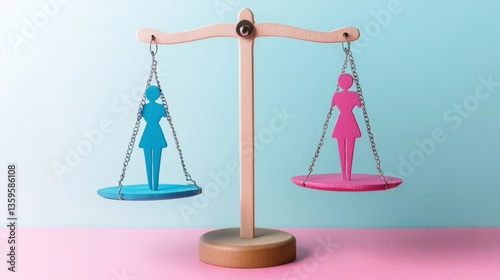 equality, sex, balance, scale, feminism, fairness, justice, pink, blue, figurine, wooden, representation, parity, symbolism, comparison, advocacy, stereotype, opportunity, model, concept, equal, right, perspective, metaphor, neutral, background, contrast, pastel, colours, objective, social, issue, value, equilibrium