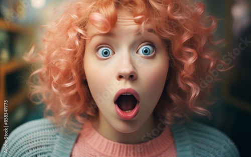 woman, shock, surprise, expression, emotion, reaction, pink, hair, curly, indoor, eye, female, reveal, vibrant, person, impact, gesture, high-coloured, truth, human, background, context, coiffure, moment, event