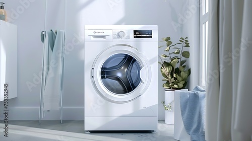 Generative AI : Modern white washing machine in a laundry room