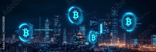 Generative ai. Futuristic city skyline, glowing bitcoin symbols, digital cryptocurrency theme, neon blue and black, high-tech urban landscape, night scene, cyberpunk style, modern architecture