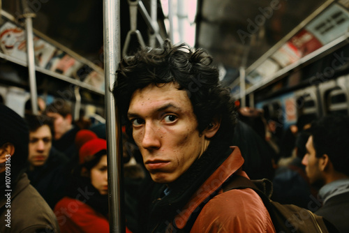 Generative AI portrait of people crowd busy day on dimly lit metro bus train public transport concept, urban scene