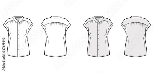 Gentle pleats shirt technical fashion illustration with loose silhouette, regular colar with stand, sleeveless. Flat blouse apparel template front, back white grey color. Women, men unisex top mockup