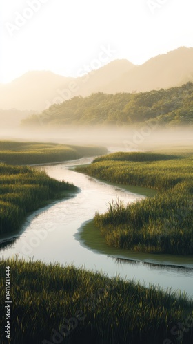 Gentle river through misty valley landscape