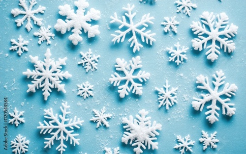 Gentle snowflakes falling on a soft blue gradient background, serene and wintery