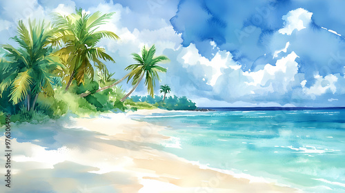 gentle, watercolor, rendering, tropical, beach, scene, water, soft, white, sand, lush, palm, tree, swaying, breeze, bright, sunlit, sky