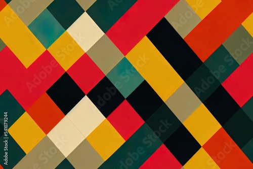 Geometric abstract texture in Bauhaus style with lemon. Seamless repeating pattern with simple shapes, mosaic of squares and triangles. 2d illustration retro illustration for background, wallpaper.