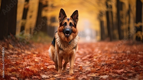 german, fall, leaf, dog, illustration, autumn, forest, shepherd, dog, path, tree, colourful, shedding, coat, earthy, tone, harmonious, scene, nature, walk, foliage, canino, wood, trail, vibrant, seasonal, outdoors, pet, landscape, gold, crisp, serene