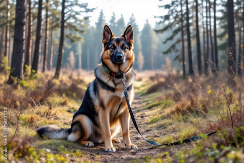 german, shepherd, with, leash, dog, dirt, path, forest, serious, expression, tall, pine, tree, clear, blue, sky, natural, lighting, shadow, fur, high, quality, peaceful, atmosphere, pet, animal, companion, walking, loyalty, training, breed, collar, cute, looking, sitting, nature, forested, landscape, photograph, calm, guard, friends, summer, greenery, scene, joyful