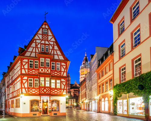Germany, Rhineland-Palatinate, Mainz, Half-timbered house and illuminated old town street at night
