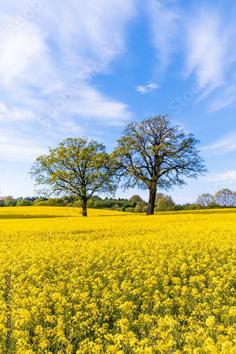 Germany, Schleswig-Holstein, Holstein Switzerland, Two trees growing in vast rapeseed field in spring