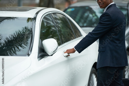 business, businessman, standing, african american, young, executive, entrepreneur, associate, professional, cropped, opening, car, automobile, transportation, vehicle, person, door, male, owner, driving, expensive, luxury, rental, parking, smiling