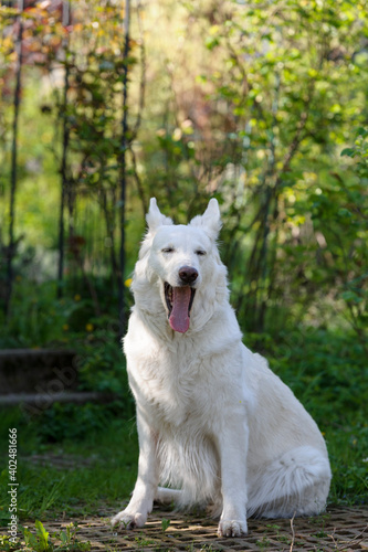 dog, animal, dog, white, female, adult, big, sit, sitting, yawn, garden, outside, natural, meadow, tree, sunny