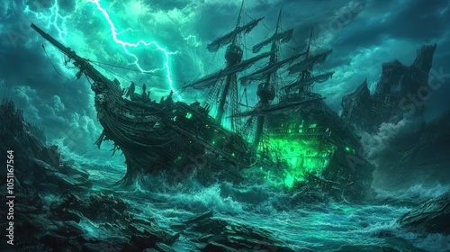 ship, ghost, storm, ocean, wave, sea, wreck, night, dark, fantasy, green, lightning, water, rocky, crash, art, illustration, digital, painting, dramatic, scarey, creepy, mystical, mysterious, ancient, ruin, fog, cloud, gloomy, silhouette, concept, design, horror, nautical