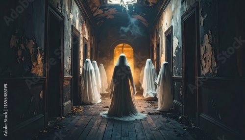 Ghostly Corridor – A long, dark hallway with floating white sheet-like ghosts fading into the shadows.