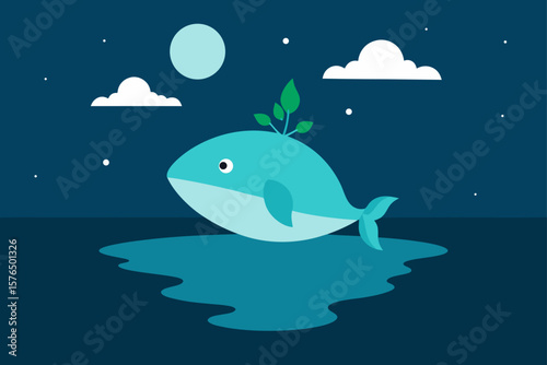 giant, fish, shaped, island, in, open, ocean, under, moonlight, surreal, fantasy, dream, magic, animal, sea, water, nature, landscape, scenery, background, design, illustration, vector, art, graphic, wallpaper, concept, scene, night, sky, star, moon, calm, peaceful, serene