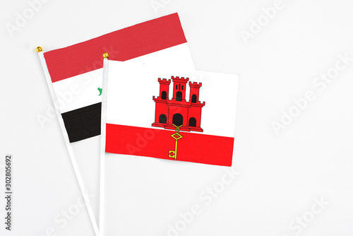 Gibraltar and Iraq stick flags on white background. High quality fabric, miniature national flag. Peaceful global concept.White floor for copy space.