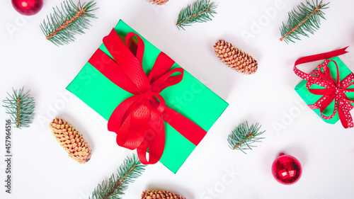 Gift boxs and Christmas decorations on color background, flat lay. Winter holidays theme. Happy new year concept.