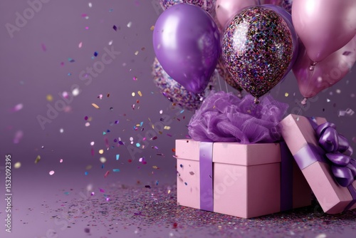 Gift's Glamour: Captured a purple gift box overflowing with celebration, showcasing vibrant balloons and shimmering confetti, perfect for conveying joy and festivity.