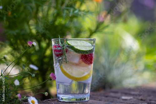 gin, tonic, summer, drink, cocktail, glasses, alcohol, party, relaxation, hot, day, raspberry, fruit, fizzy, sparkling, lime, lemon, rosemary, ice, cube, fresh, refreshment, beverage, citrous, slice, garden, outside, cold