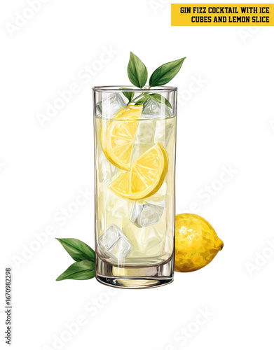 Gin Fizz cocktail with lemon slice and ice in highball glass on yellow background. Watercolor illustration of gin-based sparkling drink with bubbles and foam. Refreshing citrus beverage concept