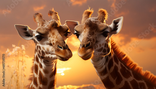 Giraffe and sunset in Africa, nature beauty in wildlife generated by AI