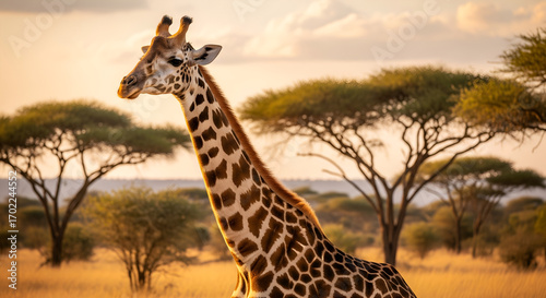 giraffe, africa, savanna, sunset, wildlife, animal, nature, wild, safari, golden hour, tanzania, kenya, mammal, herbivore, long neck, spot, pattern, african wildlife, wild animal, evening, serene, peaceful, majestic, beauty, travel, tour tourism, adventure, exploration, conservation, endangered species, biodiversity, ecosystem, habitat, wilderness, golden light, warm colors, scenic, landscape, outdoors, wild nature, animal portrait, graceful, elegant