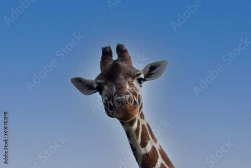 giraffe, animal, mammal, neck, wildlife, head, zoo, nature, safari, wild, tall, sky, long, portrait, blue, spot, cute, funny, face, isolated, pattern, animal, big, closeup, brown