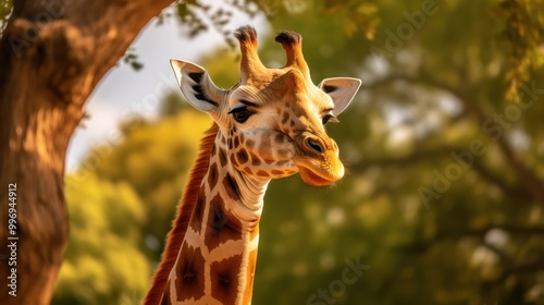 giraffe, head, portrait, pattern, animal, wildlife, neck, spot, closeup, eye, gentle, expression, gold, light, warm, sun, nature, zoo, safari, african, fauna, mammal, photo, background, tree, leaf, green, brown, yellow, beautiful, cute, tall, long, unique, gorgeous