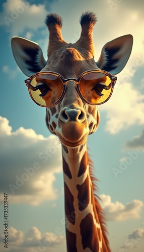 giraffe, sunglasses, animal, playful, outdoors, daytime, whimsical, humorous, wildlife, sky, fun, nature, african, tall, mammal, safari, zoo, colourful, bright, sunshine, cheerful, unique, fashion, cool, headwear, blithe, smile, entertainment, wild, happy, furry, long neck, playfulness, animal, day, sunny, behaviour, character, environment, funny, sightseeing
