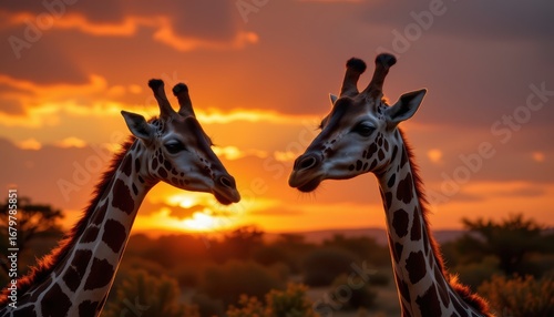 Giraffes, towering silhouettes against a savannah sunset ablaze with chromatic fire, blissful visages rendered in radiant light utilizing dramatic forced perspective, Subject anchored left; expansive