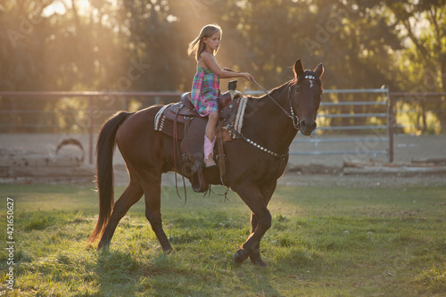 training, field, horse, riding, girl, animal, ranch, holding, dress, childhood, sunlight, leisure, enjoyment, excitement, fun, casual attire, one animal, domestic animals, animal themes, rural scene, american culture, paddock, equestrianism, mammal, hobby, horizontal, outdoors, day, one person, full-length, casual clothes, rural, equestrian, avocation, half face, female, children, children, adolescence, youth, sunshine, enjoy, enjoying, exited, exciting, amusement, daytime