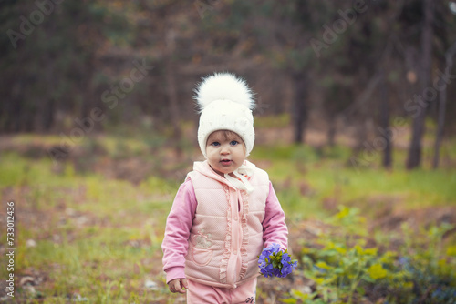 girl baby in a white hat walks in the spring forest