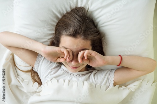 Girl child wakes up, rubs eyes. Lying on a pillow in bed, top view